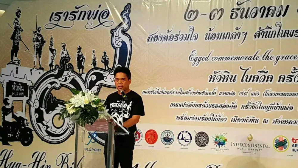 โดยมี นายนพพร วุฒิกุล นายกเทศมนตรีเมืองหัวหิน และนายอัครวิชย์ เทพาสิต ผู้อำนวยการ ททท.สำนักงานเพชรบุรี ร่วมแถลงข่าว พร้อมแขกผู้มีเกียรติร่วมงาน วัตถุประสงค์ของการจัดงาน เพื่อแสดงความจงรักภักดีและน้อมสำนึกในพระมหากรุณาธิคุณหาที่สุดมิได้ของพระบาทสมเด็จพระปรมินทรมหาภูมิพลอดุลยเดช โดยกลุ่มรถบิ๊กไบค์และรถชอปเปอร์ประมาณ 5,000 คัน จะรวมตัวกันที่อุทยานราชภักดิ์ อำเภอหัวหิน เพื่อร่วมแปรอักษร คำว่า “พ่อ ภูมิพลมหาราช” ในวันที่ 3 ธันวาคม 2559 ร่วมจุดเทียนถวายอาลัยและร่วมกันร้องบทเพลงของพ่อ ในการนี้ ผู้เข้าร่วมกิจกรรมจำนวนหนึ่งจะเดินทางเข้าร่วมทำกิจกรรม csr ในโครงการ "สานต่องานที่พ่อทำ สร้างฝายชะลอน้ำ 89 ฝาย" ณ หน่วยจัดการต้นน้ำ โครงการตามพระราชประสงค์หุบกะพง ในช่วงบ่ายวันที่ 2 ธันวาคม 2559 ด้วย