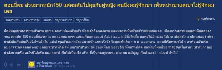 ตอนนี้ผม อ้วนมากหนัก150 แต่ผมดันไปคุยกับผู้หญิง คนนึงผมรู้จักเขา เห็นหน้าเขาแต่เขาไม่รู้จักผมเลย