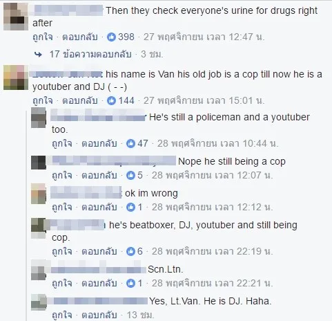 นอกจากนี้ยังมีคอมเมนต์จากชาวไทยระบุว่า ตำรวจในคลิปคือ หมวดแวน Rap is now หรือ หมวดแวน Doubletap ซึ่งมีอาชีพหลักเป็นตำรวจ ทำหน้าที่มวลชลสัมพันธ์ และเป็นดีเจ แถมยังนิสัยดี มีน้ำใจอีกด้วย