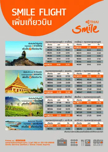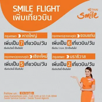 สายการบินไทยสมายล์ ขอมอบความสะดวกสบายให้แก่ผู้โดยสารมากยิ่งขึ้น ด้วยการเพิ่มเที่ยวบินจากกรุงเทพฯ (สุวรรณภูมิ) สู่ 4 เส้นทาง พร้อมบินสบายกับบริการแบบฟูลเซอร์วิส ได้แก่ กรุงเทพฯ-หาดใหญ่ เพิ่มเป็น 7 เที่ยวบิน/วัน กรุงเทพฯ (สุวรรณภูมิ)-ขอนแก่น เพิ่มเป็น 6 เที่ยวบิน/วัน กรุงเทพฯ (สุวรรณภูมิ)-เชียงใหม่ เพิ่มเป็น 5 เที่ยวบิน/วัน และ กรุงเทพฯ-นราธิวาส เพิ่มเป็น 2 เที่ยวบิน/วัน สอบถามรายละเอียดเพิ่มเติมหรือสำรองบัตรโดยสารได้ที่ www.thaismileair.com Smile Call Center 1181, 02-118-8888 หรือ ศูนย์บริการลูกค้าไทยสมายล์ ณ สนามบินต่างๆ (Smile Service Center) และตัวแทนจำหน่ายบัตรโดยสารสายการบินไทยสมายล์ทุกแห่ง