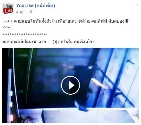 วันที่ 2 ธ.ค. 59 ในเพจเฟซบุ๊ก “YouLike (คลิปเด็ด)” ได้แชร์คลิปนาทีที่ชายคนหนึ่งเผลอเดินถอยหลังพลาดตกลิฟท์ สันนิฐานขณะที่คุ้มงานชายอีกคนหนึ่งแล้วได้พลาดพลั้งตกลงไป ซึ่งในโพสต์มีข้อความระบุว่า…