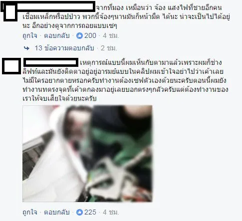 ซึ่งทำให้มีผู้ชมคลิปเข้ามาแสดงความคิดเห็นกันเป็นจำนวนมาก อาทิ จากที่มอง เหมือนว่า จ้อง แสงไฟที่ชายอีกคนเชื่อมเหล็กหรือปป่าว พวกนี้จ้องๆนานมันก็หน้ามืด ได้นะ น่าจะเป็นไปได้อยู่นะ อีกอย่างดูจากการถอยแบบเซๆ,เหตุการณ์แบบนี้ผมเห็นกับตามาแล้วเพราะผมก็ช่างลิฟท์และมันยังติดตาอยู่อยู่อารมย์แบบในคลิปผมเข้าใจอย่าไปว่าเค้าเลยไม่มีใครอยากตายหรอกครับทำงานต้องเซฟตัวเองด้วยนะครับตอนนี้ผมยังทำงานทตรงจุดที่เค้าตกลงมาอยู่เลยบอกตรงๆกลัวครับแต่ต้องทำงานของเราให้จบเสียใจด้วยนะครับ
