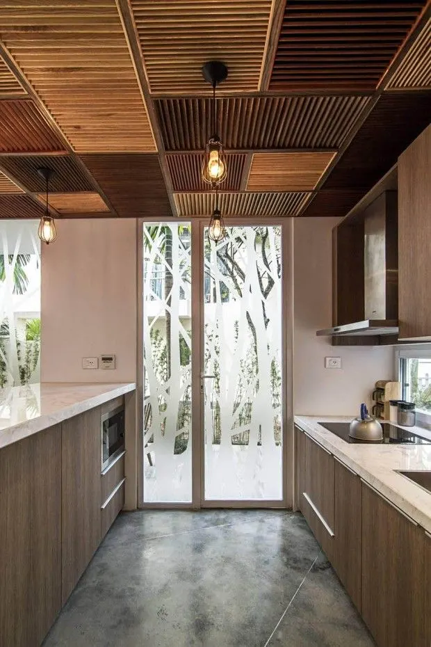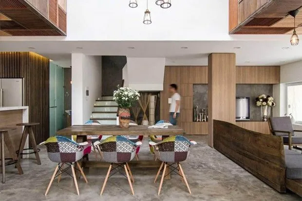 วันนี้บ้านไอเดีย ขอนำแบบบ้านในประเทศเพื่อนบ้านใกล้ๆมาให้ชมกันบ้าง บ้านสวยหลังนี้ตั้งอยู่ที่ประเทศเวียดนาม เป็นบ้านที่มีการตกแต่งได้อย่างมีดีไซน์ โดยให้ธรรมชาติมีส่วนรวมกับภายในบ้าน เพื่อเพิ่มความผ่อนคลายให้กับผู้อยู่อาศัย บ้านมีทั้งหมด 3 ชั้นด้วยกัน เพดานตรงกลางของชั้นแรกจะสูงโปร่งจนไปถึงชั้นสอง ทำให้เกิดความปลอดโปร่งไม่อึดอัด ตกแต่งไว้สำหรับเป็นห้องนั่งเล่น ห้องครัว ห้องรับประทานอาหาร ประตูกระจกบานเฟี้ยมเปิดกว้าง เชื่อมต่อกับระเบียงไม้นอกบ้าน ที่มีการปลูกต้นไม้ ดอกไม้ไว้อย่างสดชื่นสบายตา ไม้เป็นวัสดุที่ได้นำมาตกแต่ง ทั้งบิวท์อิน เคาเตอร์ เฟอร์นิเจอร์หลักของบ้าน