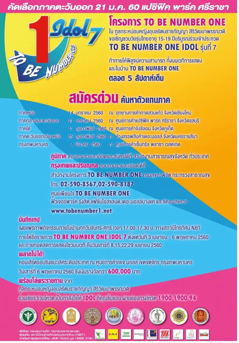 ขอเชิญเข้าร่วมชมการแสดงในโครงการ TO BE NUMBER ONE ในทูลกระหม่อมหญิงอุบลรัตนราชกัญญา สิริวัฒนาพรรณวดี กับการเข้าประกวด To be number one idol รุ่นที่ 7 ท้าทายให้พิสูจน์ความสามารถ ทั้งบนเวทีการแสดง และในบ้าน To be number one ตลอด 5 สัปดาห์เต็ม คัดเลือกภาคกลาง และภาคตะวันออก วันเสาร์ที่ 21 มกราคม 2560 ณ แปซิฟิค ฮอลล์ ชั้น 4 ศูนย์การค้าแปซิฟิค พาร์ค ศรีราชา จ.ชลบุรี สอบถามเพิ่มเติมได้ที่ สำนักงานสาธารณสุขจังหวัด ทั่วประเทศ