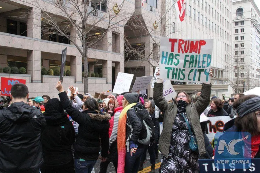 หนึ่งชั่วโมงก่อนที่จะเริ่มพิธีสาบานตน ผู้ประท้วงทรัมป์ราว 500 คน ที่ส่วนใหญ่แต่งชุดดำ ร่วมกันเดินขบวนบนถนนที่ใกล้กับทำเนียบขาว อีกทั้งยังชูป้ายต่อต้านต่างๆ เช่น "No Hate, No Place" และ "Make Racists Afraid Again."