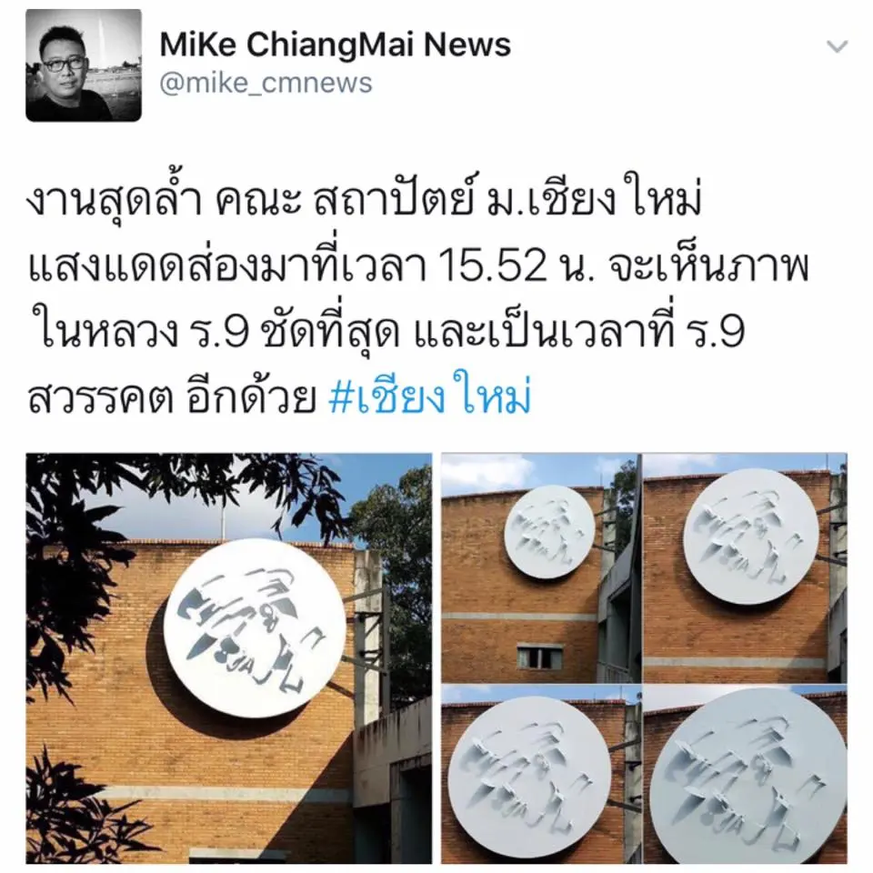 ผู้ใช้Twitter ชื่อ MiKe ChiangMai News ได้เผยแพร่ภาพ งานศิลปะของคณะ สถาปัตย์ ม.เชียงใหม่ พร้อมอธิบายงานศิลปะชิ้นนี้ว่า " งานสุดล้ำ คณะสถาปัตย์ ม.เชียงใหม่ แสงแดดส่องมาที่ เวลา 15.52น. จะเห็นภาพ ในหลวง ร.9 ชัดที่สุด และเป็นเวลาที่ ร.9 สวรรคต อีกด้วย #เชียงใหม่