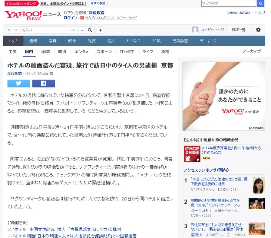 25 มกราคม 2560 มีรายงานข่าวด่วนว่า กระทรวงต่างประเทศเตรียมแถลงรองอธิบดีโดนจับที่ญี่ปุ่นโดยยอมรับว่า ได้รับทราบรายงานจากสถานทูตไทยประจำกรุงโตเกียว กรณีที่รองอธิบดีกรมทรัพย์สินทางปัญญา กระทรวงพาณิชย์ ถูกเจ้าหน้าที่เมืองเกียวโต จับที่ญี่ปุ่น ฐานขโมยภาพวาด 3 ภาพ มูลค่า หนึ่งหมื่นห้าพันเยน ของโรงแรมที่ญี่ปุ่นแล้ว หลังจากที่พนักงานโรงแรมทราบว่า ภาพวาดดังกล่าวได้หายไปจากชั้น9 และชั้น 10 จากนั้นจึงทำการเปิดกล้องจรปิด พบว่ามีผู้ได้ขโมยภาพวาดไป จึงตรวจสอบก่อนที่ชายผู้ต้องสงสัยจะเชคเอ้าท์ จึงพบภาพวาดดังกล่าวอยู่ในกระเป๋าของ รองอธิบดีฯ คนดังกล่าว จึงแจ้งความไว้