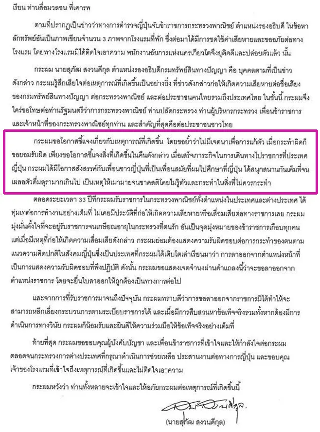 วันนี้ 31 มกราคม 2560 รองอธิบดีกรมทรัพย์สินทางปัญญา นายสุภัฒ สงวนดีกุล ผู้ต้องหา ขโมยภาพ ในโรงแรมญี่ปุ่น ได้เผยแพร่เอกสารชี้แจงเหตุการณ์ที่เกิดขึ้นต่อสื่อมวลชนโดยมีเนื้อหาดังนี้