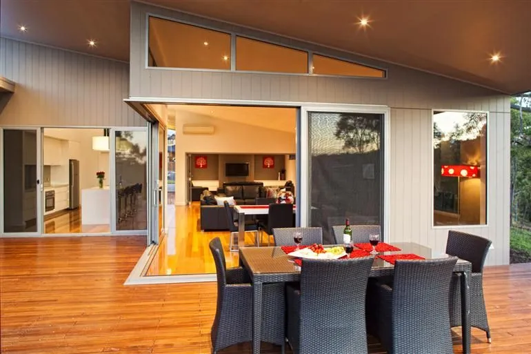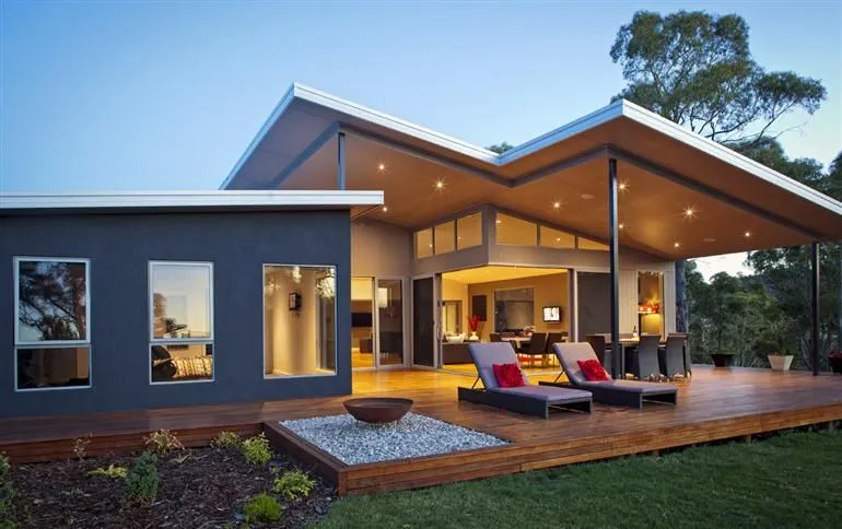 แบบ้านชั้นเดียวที่น่าสนใจ หลังคาเพิงหมาแหงนเป็นวัสดุเมทัลชีท ด้านหลังบ้านถูกออกแบบเป็นเฉลียงไม้ใต้ชายคาที่เปิดโล่ง ใช้เป็นมุมพักผ่อนของครอบครัว ดูสบายๆ ได้อารมณ์พักผ่อนมากๆ เลย โดยในส่วนของเฉลียงหลังบ้านนั้นยังถูกออกแบบให้เชื่อมต่อกับห้องนั่งเล่นภายในบ้าน เชื่อมโยงภายนอกภายในดูโมเดิร์นทันสมัยมากๆ ภายนอกตัวบ้านใช้โทนสีเทาดูเคร่งขรึม