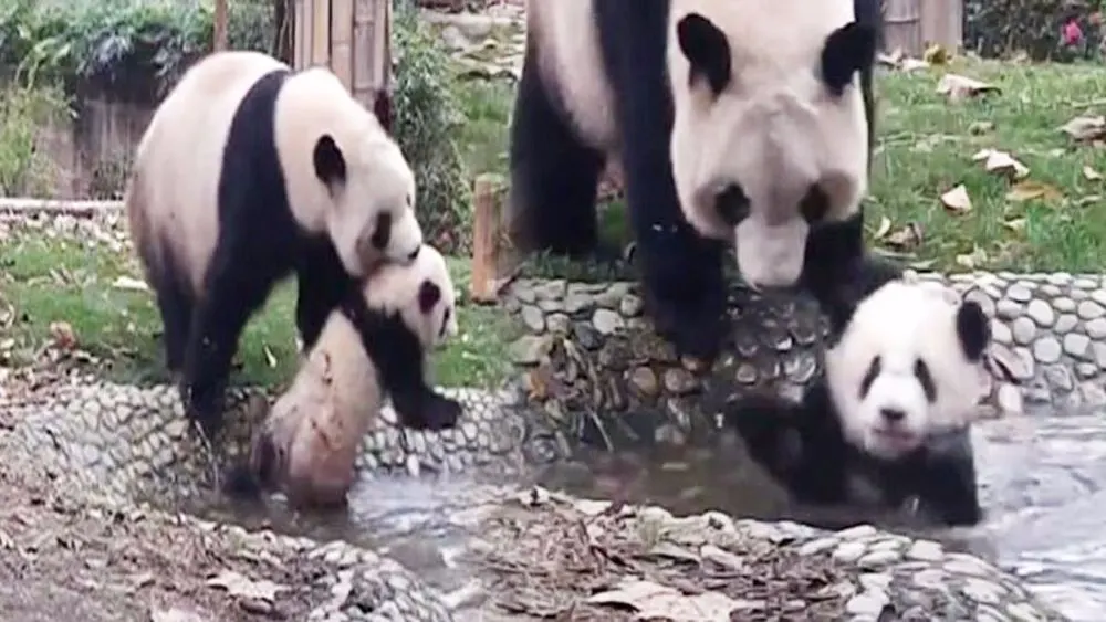 แม่แพนด้าพยายามคาบลูกไปอาบน้ำ น่าร๊ากก