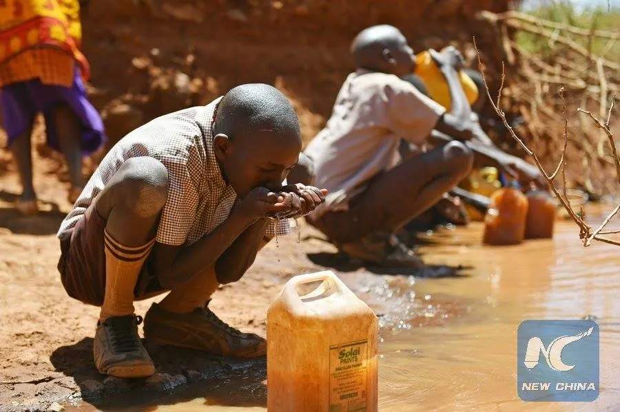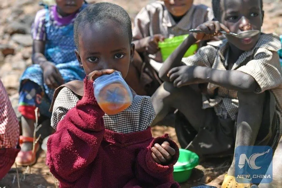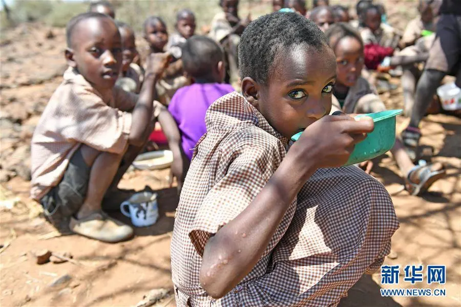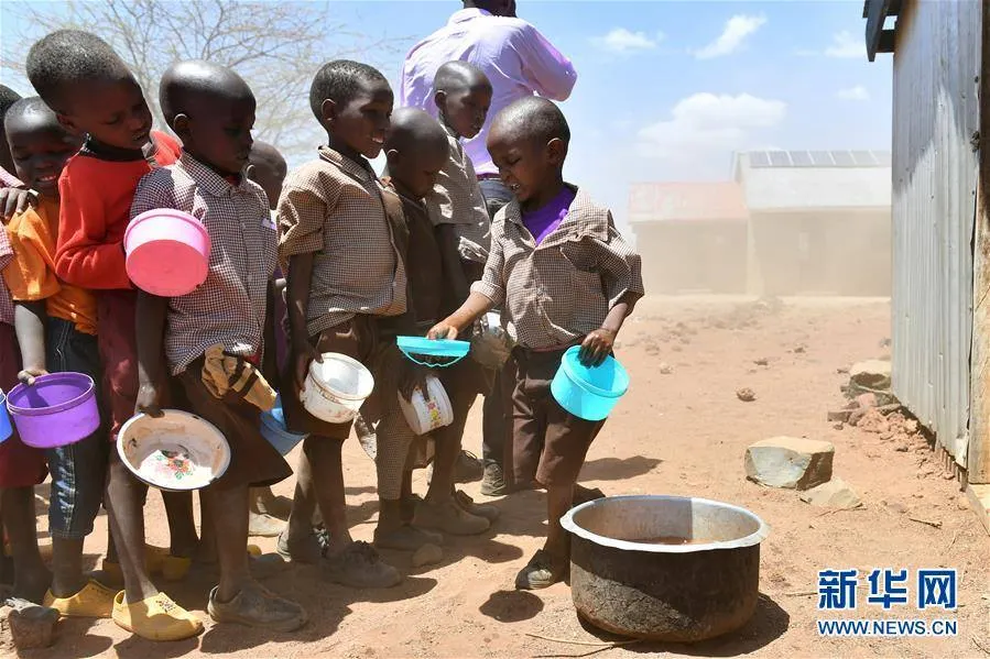 ภาพของเด็กจากโรงเรียนประถมในประเทศเคนยา ทางตะวันออกของแอฟริกา กำลังกินน้ำที่เต็มไปด้วยโคลน และกินโจ๊กที่ต้มจากธัญพืชที่รัฐบาลส่งมาช่วยเหลือ ซึ่งเนื่องจากฤดูแล้งติดต่อกันยาวนาน ทำให้เกิดปัญหาขาดแคลนธัญพืช