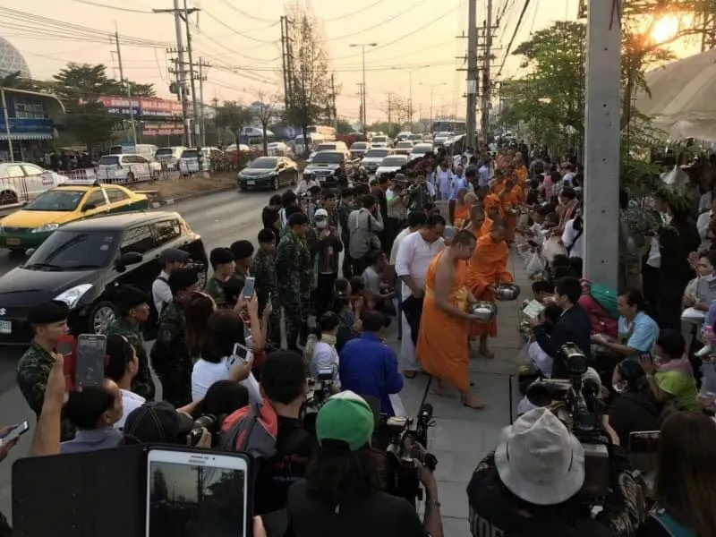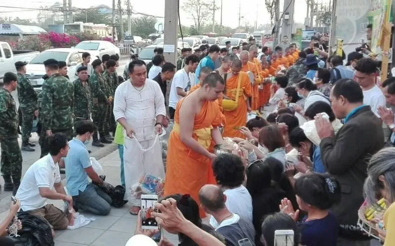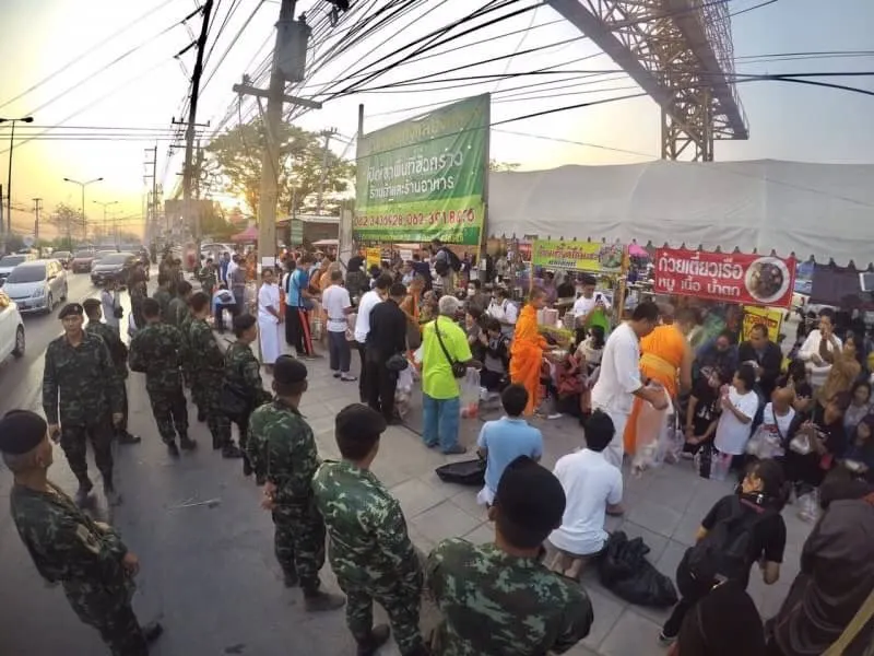 ยอมใจธรรมกาย!! ขณะทหารตำรวจล้อมวัด 100% ยังเชิญชวนสาธุชนที่มาเป็นกำลังใจร่วมตักบาตร คนแน่นซะด้วย!! ชาวบ้านก็มากันเยอะมาก พ่อค้าแม่ค้ายิ้มแก้มปริ ดีใจที่ขายดี ถึงแม้บรรยากาศจะคล้าย 4 จังหวัดชายแดนภาคใต้ก็เถอะ แต่ก็ดีต่อใจนะ