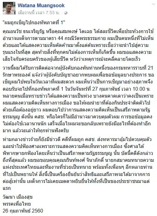 วานนี้ผมได้รับการติดต่อจากผู้บังคับกองพันท่านหนึ่งของกรมทหารราบที่ 21 รักษาพระองค์ แจ้งว่าผู้บังคับบัญชาอยากพบผมเพื่อขอข้อมูลบางประการ ขอเชิญผมไปพบในวันเวลาที่ผมสะดวก ผมเห็นว่าเป็นการเชิญมาอย่างสุภาพจึงตอบรับจะไปที่กองทัพภาคที่ 1 ในวันจันทร์ที่ 27 กุมภาพันธ์ เวลา 10.00 น. หลายคนเมื่อทราบข่าวได้แสดงความเป็นห่วง บางคนคาดเดาว่าคงเป็นเพราะผมแสดงความคิดเห็นทางการเมือง ขอให้ผมนำยาที่ต้องกินประจำติดตัวไปด้วยเผื่อต้องอยู่ยาว ผมตอบไปว่าการแสดงความคิดเห็นเป็นเสรีภาพตามรัฐธรรมนูญ ดังนั้น คสช. หรือใครก็ไม่มีอำนาจมาควบคุมตัวผม การขอข้อมูลคงไม่ต้องใช้เวลานานนัก เสร็จเมื่อไรผมจะขอกลับเพราะยังมีอะไรที่ต้องทำอีกมาก แล้วจะเล่าให้ทุกท่านฟังครับ