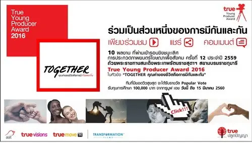 ทรูมูฟ เอช ขอเชิญชวนนิสิต นักศึกษา และประชาชนทั่วไป คลิกเข้าชม10สุดยอดผลงานภาพยนต์โฆษณาเพื่อสังคม “TOGETHER คุณค่าของชีวิตคือการมีกันและกัน” พร้อมให้กำลังใจ และแชร์ส่งต่อเรื่องราวออกไปให้กว้างไกลที่สุด ในโครงการประกวดภาพยนตร์โฆษณาเพื่อสังคม ครั้งที่ 12 ประจำปี 2559 True Young Producer Award 2016 ถ้วยพระราชทานสมเด็จพระเทพรัตนราชสุดาฯ สยามบรมราชกุมารี เพื่อเฟ้นหาผลงานที่ได้คะแนนรวมสูงสุด จากยอดเข้าชม ยอดแชร์ และคอมเมนท์ (ในทางบวก) รับทุนการศึกษา 100,000 บาท ตั้งแต่วันนี้ ถึงวันที่ 15 มีนาคม 2560 ทาง www.youtube.com/TrueMoveH