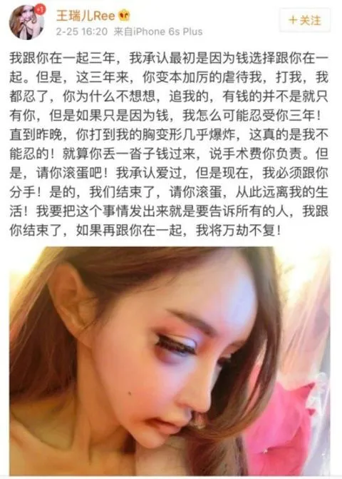 เว็บไซต์เชียงไฮอิสต์รายงานว่า นางแบบสาวจีนและเป็นเน็ตไอดอลชื่อดังทนไม่ไหวโพสต์รูปตัวเองหลังถูกแฟนซ้อมจนใบหน้าที่ทำศัลยกรรมฟกช้ำไปหมด และซิลิโคนหน้าอกที่ไปผ่าตัดเสริมขนาดมาแทบแตก และยังโพสต์ภาพเห็นรอยฟกช้ำที่ใบหน้า และบาดแผลที่หน้าอกด้วย