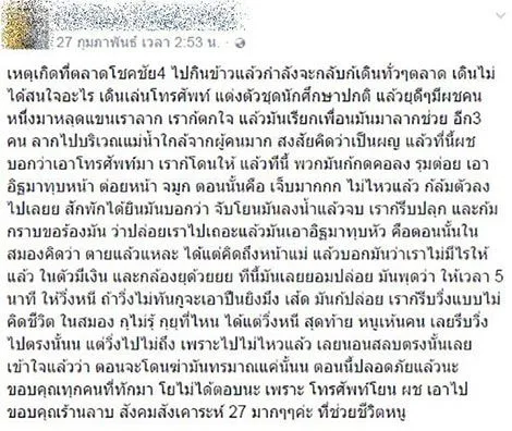 จากกรณีนักศึกษาสาวโดนฉุด ที่โชคชัย 4 โดยเจ้าตัวได้โพสต์บอกเล่าเรื่องราวเตือนภัยเพื่อเป็นอุทาหรณ์ผ่านเฟซบุ๊ก ทำนองว่า ไปกินข้าวย่านตลาดโชคชัย 4 แต่ในขณะที่เธอก้มหน้าเล่นมือถืออยู่นั้น เกิดเหตุคนร้าย 4 คน มาฉุดแขนและลากไปที่เปลี่ยว ก่อนจะทำร้ายร่างกายและปล้นทรัพย์ จนตัวเธอเองนั้นได้รับบาดเจ็บตามร่างกายหลายแห่งนั้น (อ่านเพิ่มเติม : เตือนภัย!! นักศึกษาสาวโดน 4 โจรหนุ่มฉุดไปซ้อม-ใช้อิฐทุบหัว ปล้นทรัพย์ แถมยังขู่ยิงทิ้ง)
