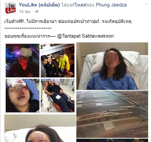 จนเปนข่าวในโซเชียลและเรื่องเด่นเย็นนี้ ในวันที่ 26 มกราคม จนในวันเดียวกันได้มีหน่วยของประปาและ สนง.เขตจตุจักร. มาทำการซ่อมแซมถนนในทันทีแต่มิได้มีการมารับผิดชอบถึงคนเจ็บเลย. จนเรารักษาตัวออกจาก. รพ. ปัจจุบันเราก้อยังต้องรักษาใบหน้าของตัวเอง ในส่วนรักษาใบหน้าให้เหมือนเดิมก้อค่อนข้างที่จะใช้เวลาและอื่นๆประกอบ