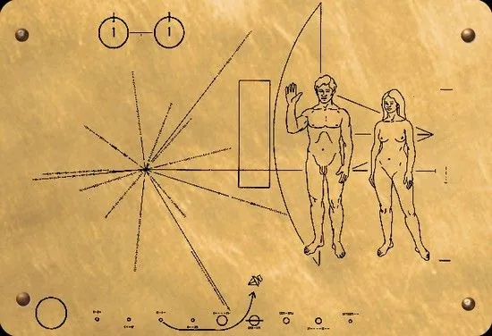 “ใครซักคน” ที่เข้าใจสัญลักษณ์ต่างๆบนแผ่นทองคำ เห็นมนุษย์ชายหญิง รู้ว่าเผ่าพันธุ์เรามี 2 เพศ หนึ่งในนั้นยกมือขวาเพื่อทักทาย เรามาแบบมิตร ร่างกายเรามีขนาดสูงเกือบเท่ายานที่คุณเจอ เราวาดรูปยานไว้ด้านหลังแล้ว