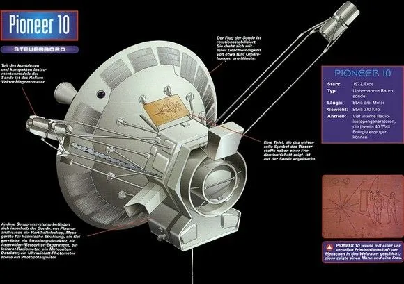 ยานไพโอเนียร์ 10 หนัก 258 กิโลกรัม ติดตั้งพลังงานปรมณูแบบ RTG เพื่อผลิตไฟฟ้าโดยไม่มีแผงเซลสุริยะ เพราะที่ๆมันจะไป แสงแดดส่องไปไม่ถึง มันมีจานสายอากาศวงกลมขนาใหญ่ที่หันมาหาโลกตลอดการเดินทาง เพื่อเอาไว้ส่งข่าวสารกลับมา และที่สำคญมันมีแผ่นอลูมิเนียมเคลือบทองคำ บรรยายความมีตัวตนของเรา เพื่อเอาไว้สื่อสารกับอารยธรรมต่างดาว ติดไว้หลังจานสายอากาศ เดินทางไปกับมันด้วย