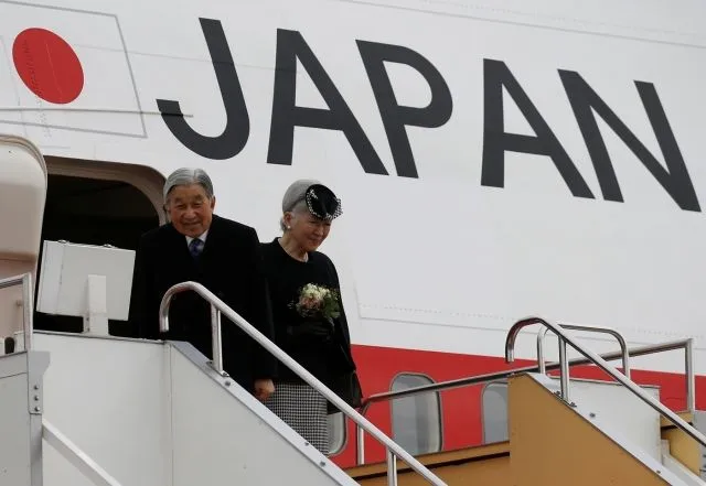 สมเด็จพระจักรพรรดิอากิฮิโตะ และสมเด็จพระจักรพรรดินีมิชิโกะ แห่งญี่ปุ่น เสด็จพระราชดำเนินเยือนเวียดนาม จากสนามบินฮาเนดะ กรุงโตเกียว วันที่ 28 ก.พ. -- Agence France-Presse/Kazuhiro Nogi.