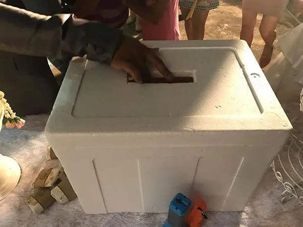 โต๊ะด้านหน้ารับแขก เอากล้องโฟมเจาะรู มาทำให้