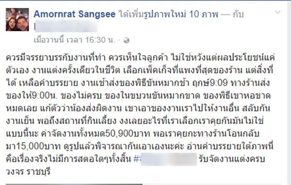 การแต่งงานถือเป็นความฝันอีกหนึ่งอย่างของผู้หญิง ที่ไม่ว่าใครก็อยากให้งานของตัวเองออกมาดีอย่างที่ใจหวัง แต่สำหรับผู้ใช้เฟซบุ๊ก “Amornrat Sangsee” แล้ว เขากลับต้องชอกช้ำ เมื่อบ่าว-สาว ได้ให้ทางร้านรับจัดงานแต่ง ช่วยจัดงานทั้งในพิธีเช้าและงานเลี้ยงในตอนค่ำ แต่ผลลัพธ์ที่ออกมากลับไม่เป็นไปตามที่ตกลงกันไว้