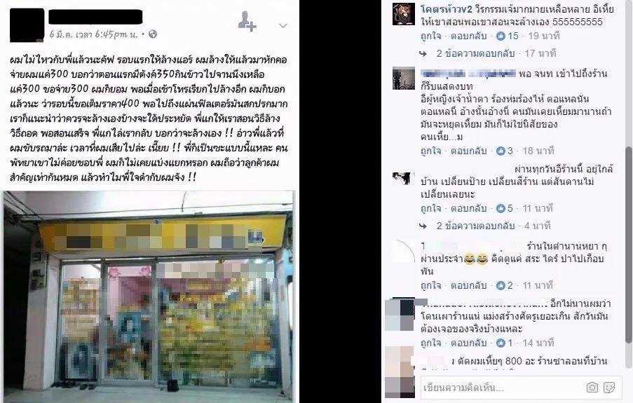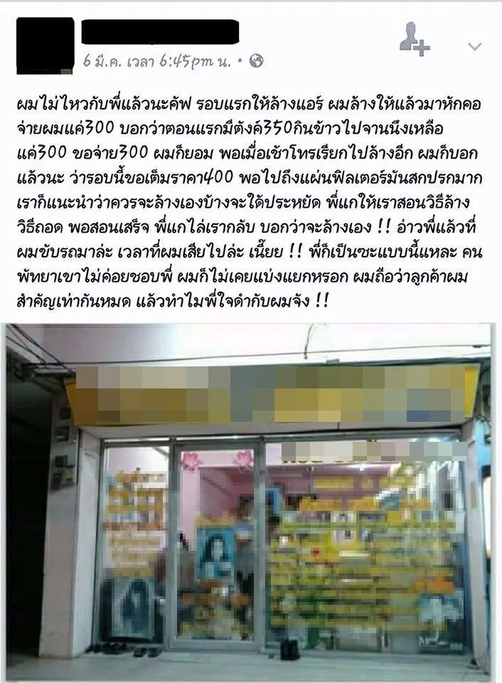 ร้านซาลอนในตำนาน ที่ฟันราคาลูกค้ามหาโหดที่เคยเป็นข่าวในโลกโซเชียลก่อนหน้านี้ ล่าสุดช่างแอร์โดนด้วย เรียกช่างแอร์มาล้างแอร์แต่หักคอ ขอลดราคา จนถึงไม่จ่ายเงินซะงั้น โดยเพจโคตรห้าวv2 ได้แชร์เรื่องราวนี้และโพสท์ว่า