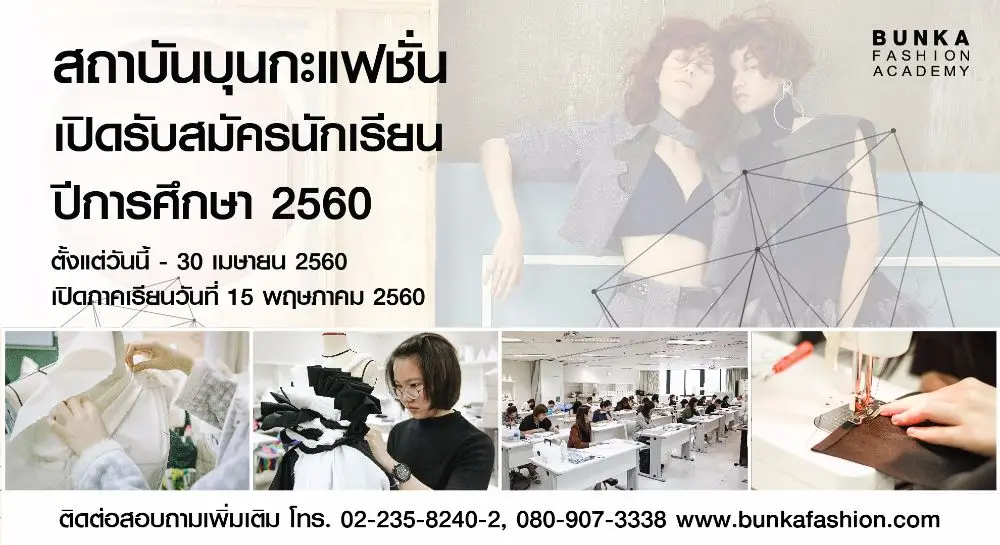 สถาบันบุนกะแฟชั่น (Bunka Fashion Academy) โรงเรียนแฟชั่นในเครือข่ายของ Bunka Fashion College ประเทศญี่ปุ่น สถาบันแฟชั่นที่มีชื่อเสียงระดับโลก ด้วยประสบการณ์และความเชี่ยวชาญทางแฟชั่นมายาวนานกว่า 94 ปี โดยเป็นผู้ที่อยู่เบื้องหลังความสำเร็จของวงการแฟชั่นประเทศญี่ปุ่น และเป็นผู้ผลักดันให้กรุง Tokyo ก้าวขึ้นเป็น 1 ใน 5 มหานครแฟชั่นของโลก ในปัจจุบันได้สร้างสรรค์ดีไซเนอร์ระดับโลกจำนวนมาก อาทิ Takada Kenzo, Yohji Yamamoto, Hiroko Koshino, Tsumori Chisato, Junya Watanabe และ Jun Takahashi เป็นต้น ด้วยหลักสูตรการเรียนการสอนที่มีมาตรฐานสูงทำให้สถาบันบุนกะแฟชั่นในประเทศไทยประสบความสำเร็จอย่างต่อเนื่องมาตลอด 12 ปี และในปีนี้ทางสถาบันฯ ได้ปรับและเพิ่มหลักสูตรใหม่ เพื่อรองรับสำหรับบุคคลที่สนใจ ซึ่งต้องการประกอบอาชีพควบคู่พร้อมกับการเรียนไปด้วย โดย เปิดรับสมัครนักเรียนหลักสูตรระยะยาว ประจำปีการศึกษา 2560 แบ่งเป็น 2 หลักสูตร ดังนี้ หลักสูตร Fashion Creation & Fashion Professional (เรียนทุกวันจันทร์ถึงวันพุธ) และ หลักสูตร Intensive Garment Creation (เรียนทุกวันเสาร์และวันอาทิตย์) ภายใต้แนวคิดการสร้างมาตรฐานอนาคตแฟชั่นไทยสู่ระดับสากล โดยเปิดรับสมัครตั้งแต่วันนี้ - 30 เมษายน 2560 กำหนดเปิดภาคเรียน 15 พฤษภาคม 2560