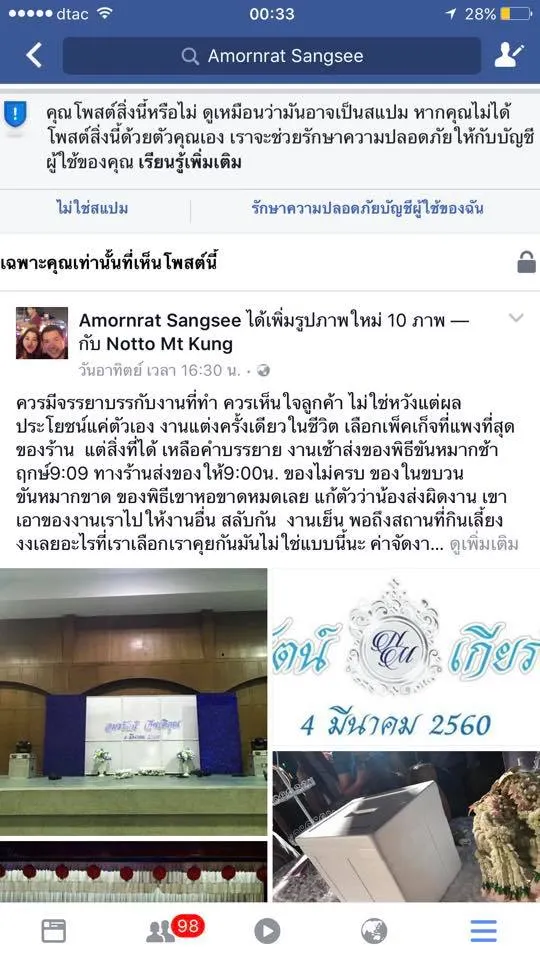ซึ่งพิธีการและการจัดงานจะมอบให้ทางออร์แกไนเซอร์เป็นคนรับ โดยตนเคยเคยให้นามบัตรออร์แกไนเซอร์กับเจ้าสาว หลังทราบข่าวจากสื่อโซเชียลและในทีวี ตนจึงได้ติดต่อไปยังเจ้าสาวขอพูดคุยว่าจะให้ทางร้านรับผิดชอบอย่างไร ซึ่งผู้ที่ทางฝ่ายเจ้าสาวติดต่อไปนั้นเป็นส่วนหนึ่งของทีมงาน แต่แอบไปรับงานกันเองโดยที่ไม่ได้แจ้งทางร้านตนจึงไม่ทราบเรื่อง และยืนยันที่ผ่านมา ตนดูแลลูกค้าเป็นอย่างดี มีผลงานด้านพรีเวดดิ้งมากว่า 10 ปี มีลูกค้าที่เคยใช้บริการมาให้กำลังใจเป็นจำนวนมาก และตอนนี้ทางร้านได้หยุดร่วมงานกับทางออร์แกไนเซอร์คนดังกล่าวแล้ว เพื่อไม่ให้เป็นการเสื่อมเสียชื่อเสียงของทางร้านอีก