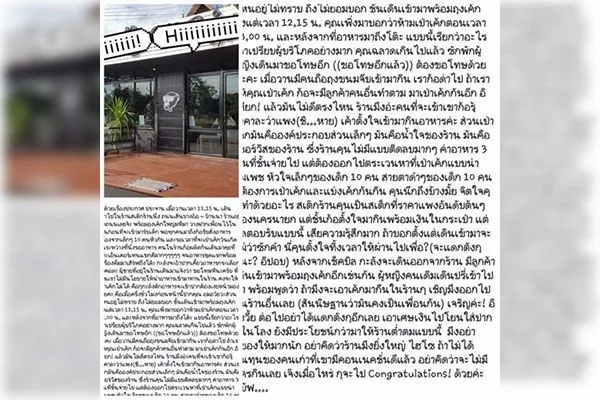 เป็นเหตุให้ลูกค้าคนดังกล่าวเกิดอาการไม่พอใจเป็นอย่างมาก จึงโพสต์ลงบนโซเชียล เพราะตัวเองก็ได้สั่งอาหารของทางร้านมาทานเหมือนกัน นอกจากนี้ยังบอกว่า ตนเดินถือถุงเค้กเข้ามาตั้งแต่เวลา 12.15 น. แต่ทำไมทางร้านเพิ่งมาห้ามเป่าเค้กตอน 13.00 น. ซึ่งเป็นเวลาหลังจากที่อาหารที่สั่งมาถึงโต๊ะแล้ว แบบนี้เรียกว่าเอาเปรียบผู้บริโภคหรือไม่