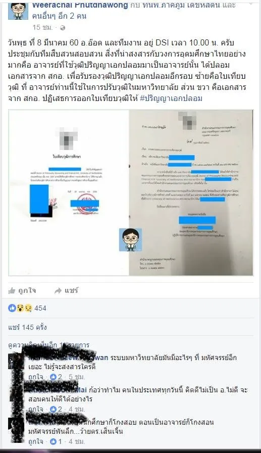 วันนี้ 8/3/2560 ทางเฟซบุ้ค คุณ Weerachai Phutdhawong ได้แชร์ เรื่องราวของ ของ บุคคลท่านนึงที่เข้ามาสมัครเป็นอาจาร์ยในมหาวิทยาลัยแห่งหนึ่ง อ้างว่าจบมาจาก อังกฤษ แต่ก็สงสัยว่า เอกสารที่ใช้ในการสมัครนั้น เป็นของจริงหรือของปลอม จึงได้ส่งให้ จนท. สอบสวน ตามข้อมูลด้านล่าง