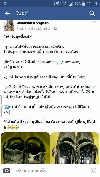 ครู : มองไปที่ชั้นวางรองเท้าของนักเรียน ไปสะดุดตากับรองเท้าคู่นี้ ถามนักเรียนว่าของใคร ???