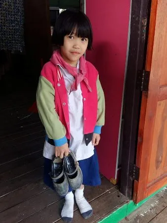ด.ญ.เดียร์ : ไม่ใช่ค่ะ รองเท้ามันคับ แม่หนูเลยตัดให้ แม่บอกว่ารอหนูขึ้น ป.3 ก่อนแม่จะซื้อให้ใหม่ เพราะแม่ไปหาซื้อที่ร้านแล้วมันมีแต่คู่ใหญ่ๆ หนูใส่ไม่ได้