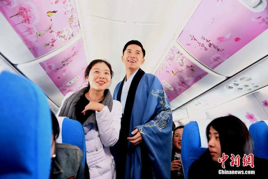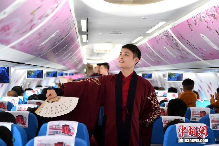 เดาว่าผู้โดยสารเมื่อขึ้นเครื่องแล้วคงเหมือนตกอยู่ในภวังค์หรือไม่ก็เหมือนได้ทะลุมิติเข้ไปในอดีต เพราะว่าพนักงานต้อนรับบนเครื่องบินล้วนเป็นชายหนุ่มรูปงามในชุดจีนราชวงศ์ฮั่น เดินแจกของขวัญแก่บรรดาผู้โดยสารหญิง ซึ่งก็ทำให้พวกเธออดไม่ได้ที่จะตะโกนว่า "สุขสันต์วันสตรีสากล" สร้างความคึกคักและอบอุ่นบนเครื่องบินได้เป็นอย่างดี