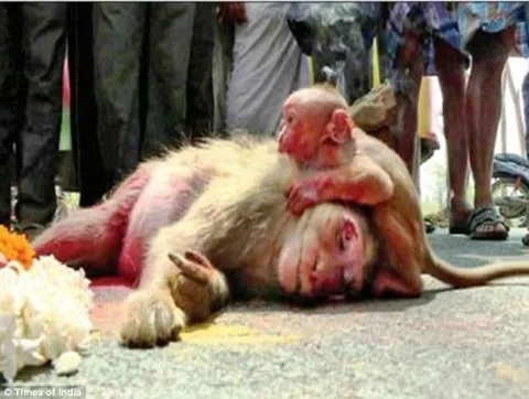 Times of India เผยภาพสุดเศร้าซึ่งเป็นเหตุการณ์ที่เกิดขึ้นทางตอนใต้ของประเทศอินเดีย โดยเผยว่าแม่ลิงตัวนี้ถูกรถชนจนตายอยู่กลางถนนลูกลิ้งพยายามที่จะปลุกแม่มันใบหน้าของมันดูโศกเศร้า ชาวบ้านและเจ้าหน้าที่ตำรวจได้นำร่างของแม่ลิงไปประกอบพิธีกรรมตามท้องถิ่น ลูกลิงก็เฝ้าติดตามไม่ห่าง