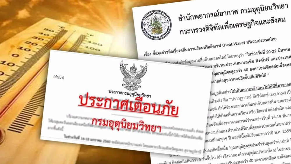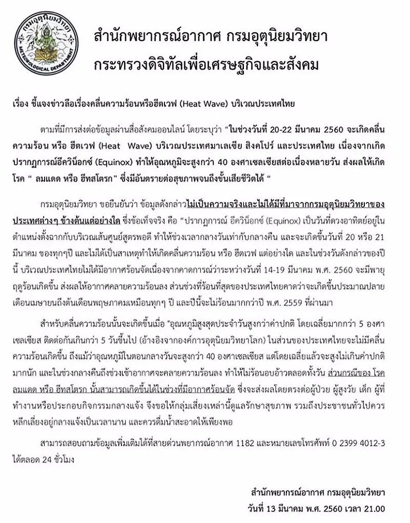 กรมอุตุนิยมวิทยา ประกาศเรื่อง กระแสข่าวลือเรื่องคลื่นความร้อนปกคลุมประเทศไทยช่วงวันที 20 - 22มีนาคม60 ไม่เป็นความจริง