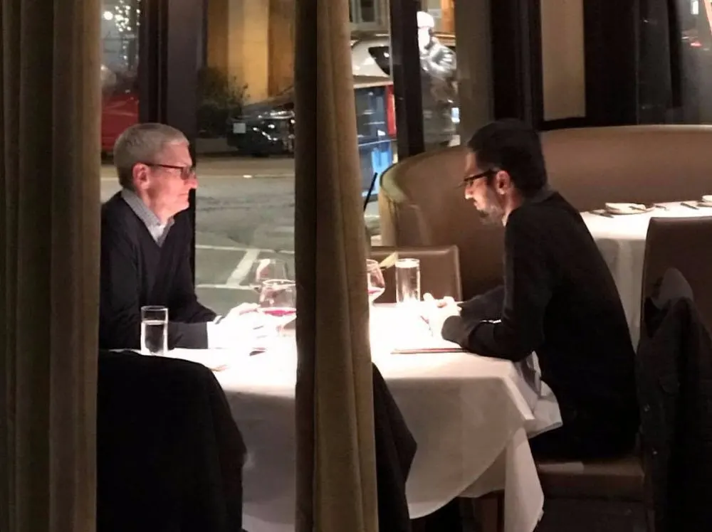 ในโลกของธุรกิจ ช่างไม่มีมิตรแท้และศัตรูถาวรเสียจริงๆ เมื่อมีคนตาดีดันไปเห็น Tim Cook นั่งคุยกับ Sundar Pichai ในร้านอาหารอย่างสนิทสนม ซึ่งเป็นเรื่องที่น่าตกใจยิ่งนัก เพราะว่าทั้งสองคนต่างเป็นถึงผู้บริหารบริษัทไอทียักษ์ใหญ่อย่าง Apple และ Google และอย่างที่รู้กันดีว่าทั้งสองบริษัทนี้เป็นคู่แข่งทางการค้ากันเสียด้วยซ้ำ แต่ไม่ทราบว่าเพราะเหตุอันใดที่ทำให้ทั้งสองคนโคจรมานั่งคุยกันเช่นนี้ได้