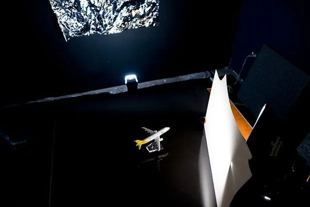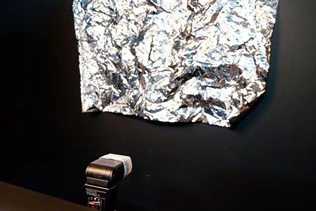 วางแฟลชที่ติดตั้งเจลไว้ให้ต่ำกว่าโต๊ะถ่ายภาพและหันหน้าไปทางฉากหลัง (ฟอยล์อลูมิเนียมที่ยับยู่ยี่) ปกติฉันจะตั้งค่าแฟลชไว้ให้ต่ำที่สุด หากแสงแฟลชแรงเกินไปฉันก็จะเอากระดาษทิชชู่วางไว้ข้างหน้าเพื่อลดความสว่างของแสงไฟ