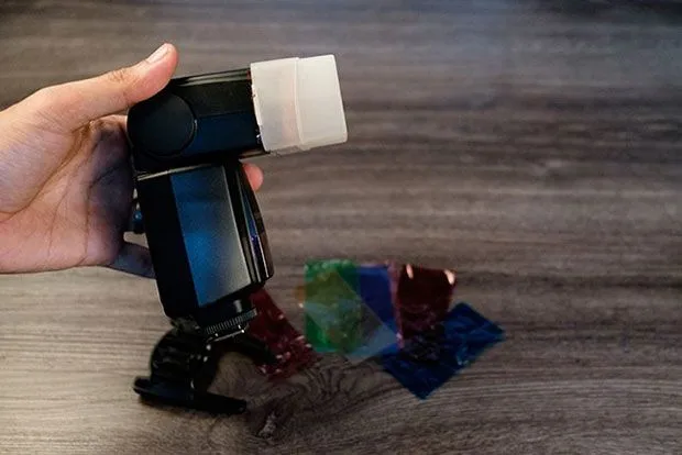 หยิบแฟลชและเลือกเจลสีสำหรับฉากหลังที่คุณต้องการ นอกจากนี้ฉันยังติดอุปกรณ์กระจายแสงแฟลชไว้บนแฟลชด้วยเพื่อให้แสงสว่างในฉากหลังมีความสมดุลมากยิ่งขึ้น