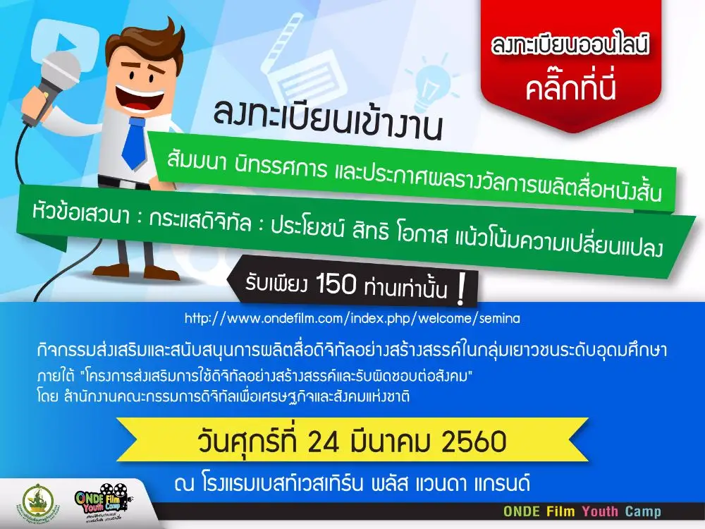 ลงทะเบียนออนไลน์เข้าร่วมสัมมนา >> http://www.ondefilm.com/index.php/welcome/semina