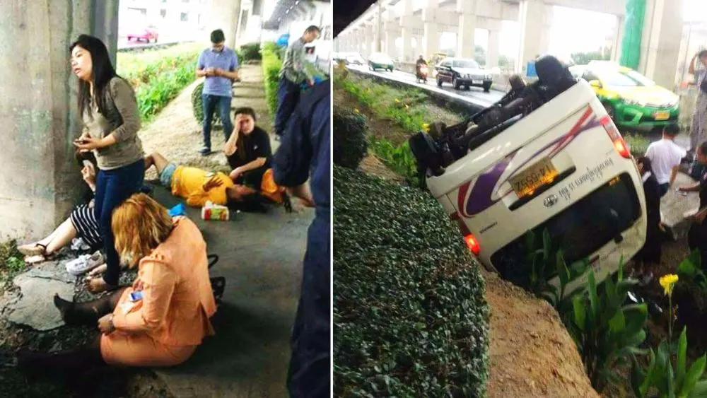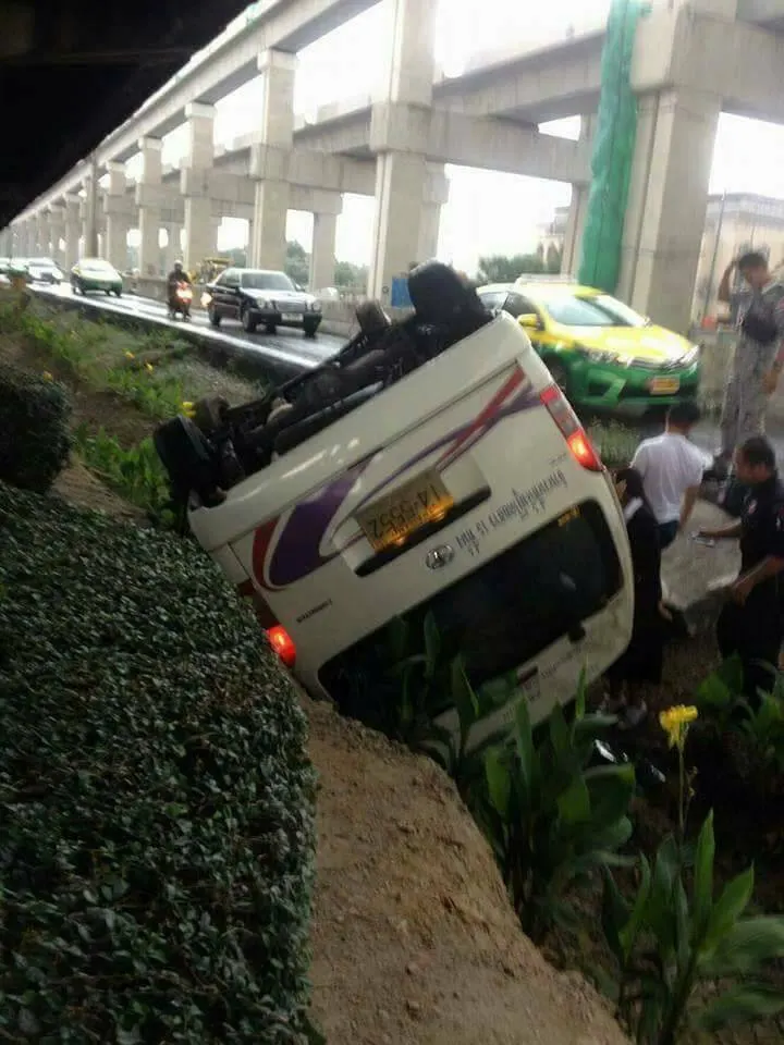 ด่วน! ฝนตกหนักถนนลื่นรถตู้เสียหลักพลิกคว่ำ หน้าคลังสินค้าดอนเมือง บาดเจ็บหลายราย