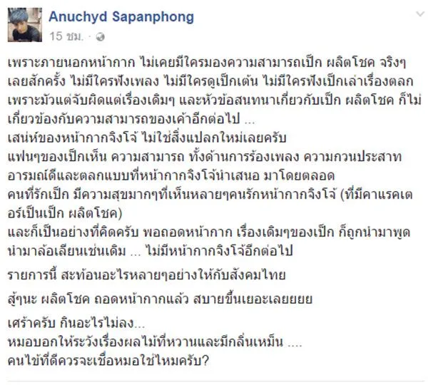 ด้าน “โอ อนุชิต” นักแสดงมากฝีมือ ก็ได้แสดงความคิดเห็นถึงกรณีดังกล่าวผ่านเฟซบุ๊ก “Anuchyd Sapanphong” โดยระบุว่า “เพราะภายนอกหน้ากาก ไม่เคยมีใครมองความสามารถเป็ก ผลิตโชค จริงๆเลยสักครั้ง ไม่มีใครฟังเพลง ไม่มีใครดูเป็กเต้น ไม่มีใครฟังเป็กเล่าเรื่องตลก เพราะมัวแต่จับผิดแต่เรื่องเดิมๆ และหัวข้อสนทนาเกี่ยวกับเป็ก ผลิตโชค ก็ไม่เกี่ยวข้องกับความสามารถของเค้าอีกต่อไป
