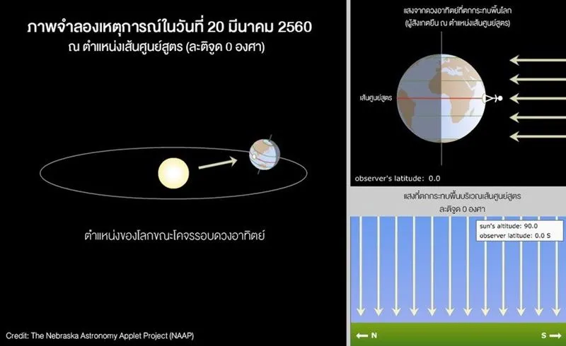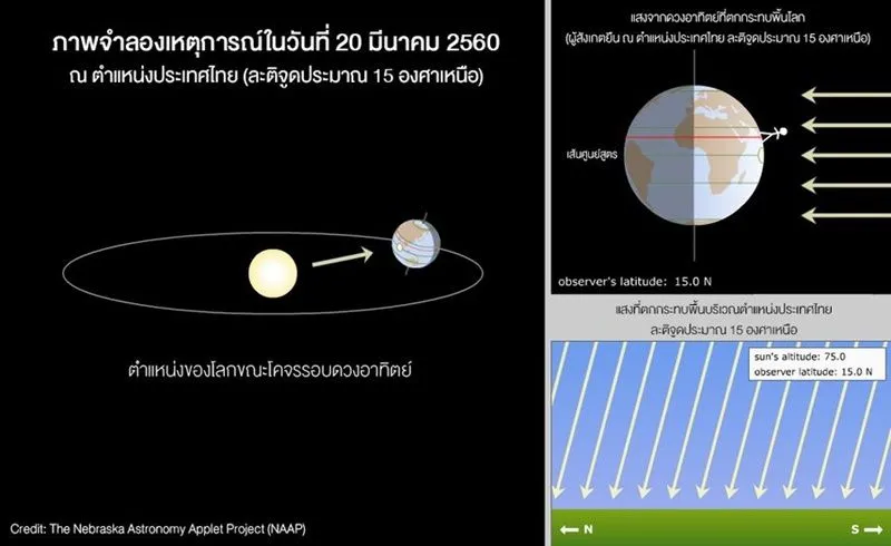 ดวงอาทิตย์จะอยู่ในตำแหน่งที่ตั้งฉากกับพื้นโลก เฉพาะบริเวณละติจูด 23.5 องศาเหนือ ถึง 23.5 องศาใต้เท่านั้น เนื่องจากแกนโลกเอียง 23.5 องศา ดังนั้นประเทศที่อยู่ในเขตร้อนเท่านั้น (ระหว่างละติจูด 23.5 องศาเหนือ ถึง 23.5 องศาใต้) ที่จะสามารถสังเกตเห็นดวงอาทิตย์ตั้งฉากได้ สำหรับวันที่ 20 มีนาคม 2560 ดวงอาทิตย์จะตั้งฉากกับพื้นที่บริเวณเส้นศูนย์สูตรโลก (ละติจูด 0 องศา) ส่วนประเทศไทยตั้งอยู่ละติจูดประมาณ 15 องศาเหนือ ดวงอาทิตย์จะตั้งฉากกับกรุงเทพฯ ในวันที่ 27 เมษายน 2560 รศ.บุญรักษา กล่าว