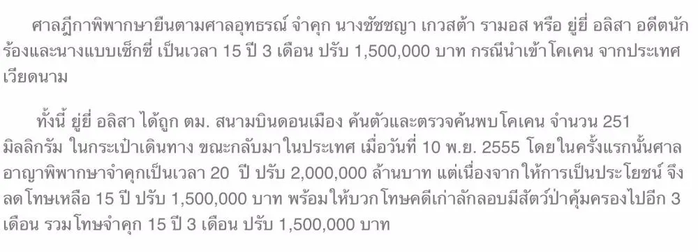 คลิปที่คุณแฟรงค์สามีของยู่ยี่อดีตนางแบบชื่อดังจัดทำขึ้นในช่วงที่ภรรยาของเขาถูกจับกุมเมื่อหลายปีก่อน ตอนนี้ศาลฎีกายกคำร้องและตัดสินให้มีความผิด คดีลักลอบนำยาเสพติดเข้ามาในราชอาณาจักรไทยพ่วงลักลอบมีสัตว์ป่าในคุ้มครองรวมโทษ สิบห้าปีปีสามเดือน