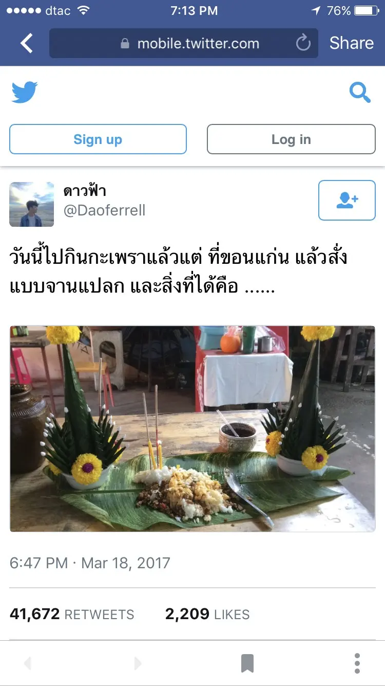 แวะเวียนไปส่องทวิตเตอร์มา เจอยูเซอร์นึงลงรูป ตอนแรกนึกว่าไปยายข้าวสาก (พิธีแจกข้าวให้ผี) พอดูดีๆเท่านั้นแหละ อ้อ!! สั่งกระเพราพิเศษ ไม่เหมือนใครและไม่มีใครเหมือน