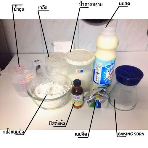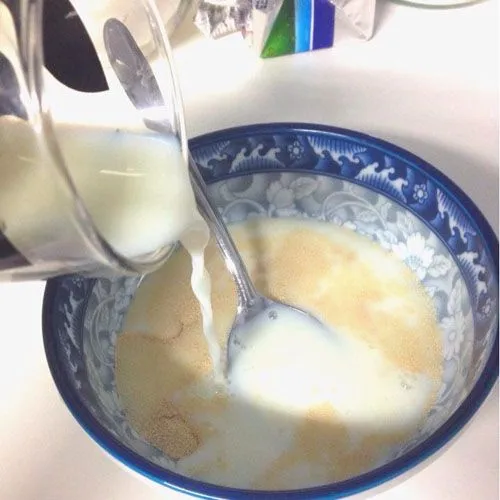 1. ผสมนมอุ่น (ย้ำ! ว่าอุ่นนะคะ ไม่งั้นเดี๋ยวยีสต์จะตาย) ผสมกับยีสและน้ำตาลลงไปหยิบมือ