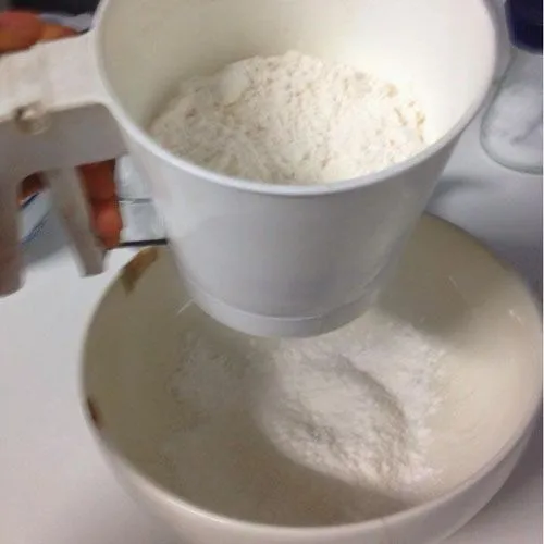2. ร่อนแป้งขนมปัง น้ำตาล เกลือ 1 รอบ พักไว้