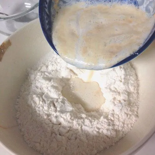 3. นำส่วนผสมที่ 1 (ที่เป็นพวกยีสต์) มาผสมกับส่วนผสมที่ 2 (ที่เป็นแป้ง)