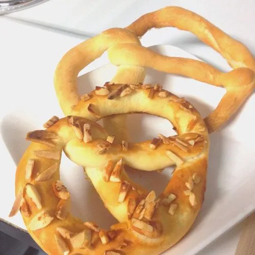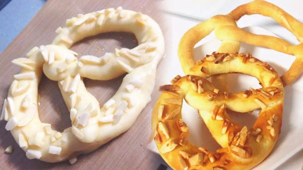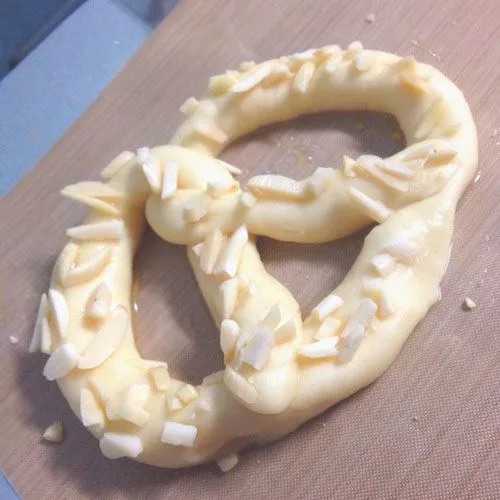 รสอัลมอนด์: ทาน้ำผึ้งบนตัวของ pretzel ก่อนนะคะ แล้วค่อยโรยอัลมอนด์ปริมาณตามชอบเลย