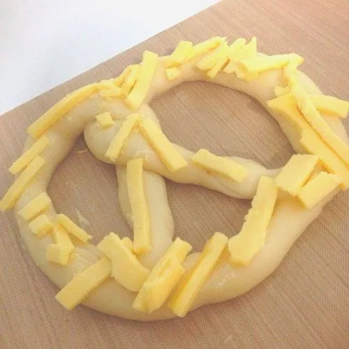 รสชีส : ทาเนยละลายบนตัว pretzel แล้วโรยชีสตามชอบเลยค่ะ